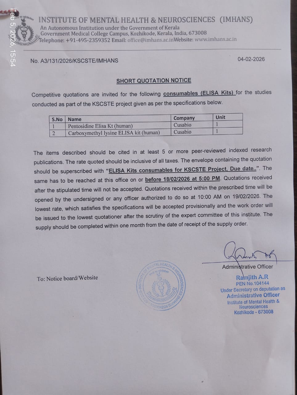 Competitive quotations are invited for following consumables (ELISA Kits) for the studies conducted as part of the KSCSTE project.